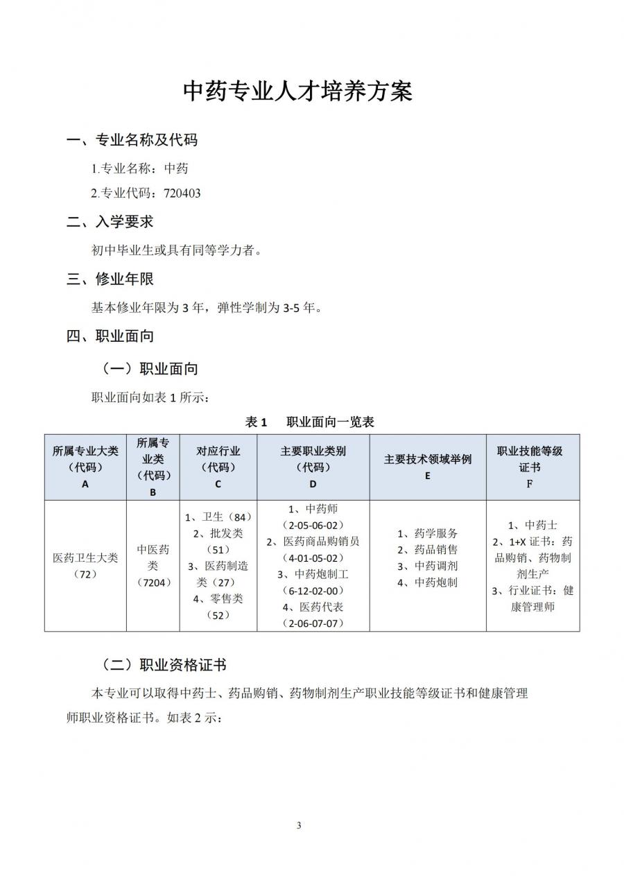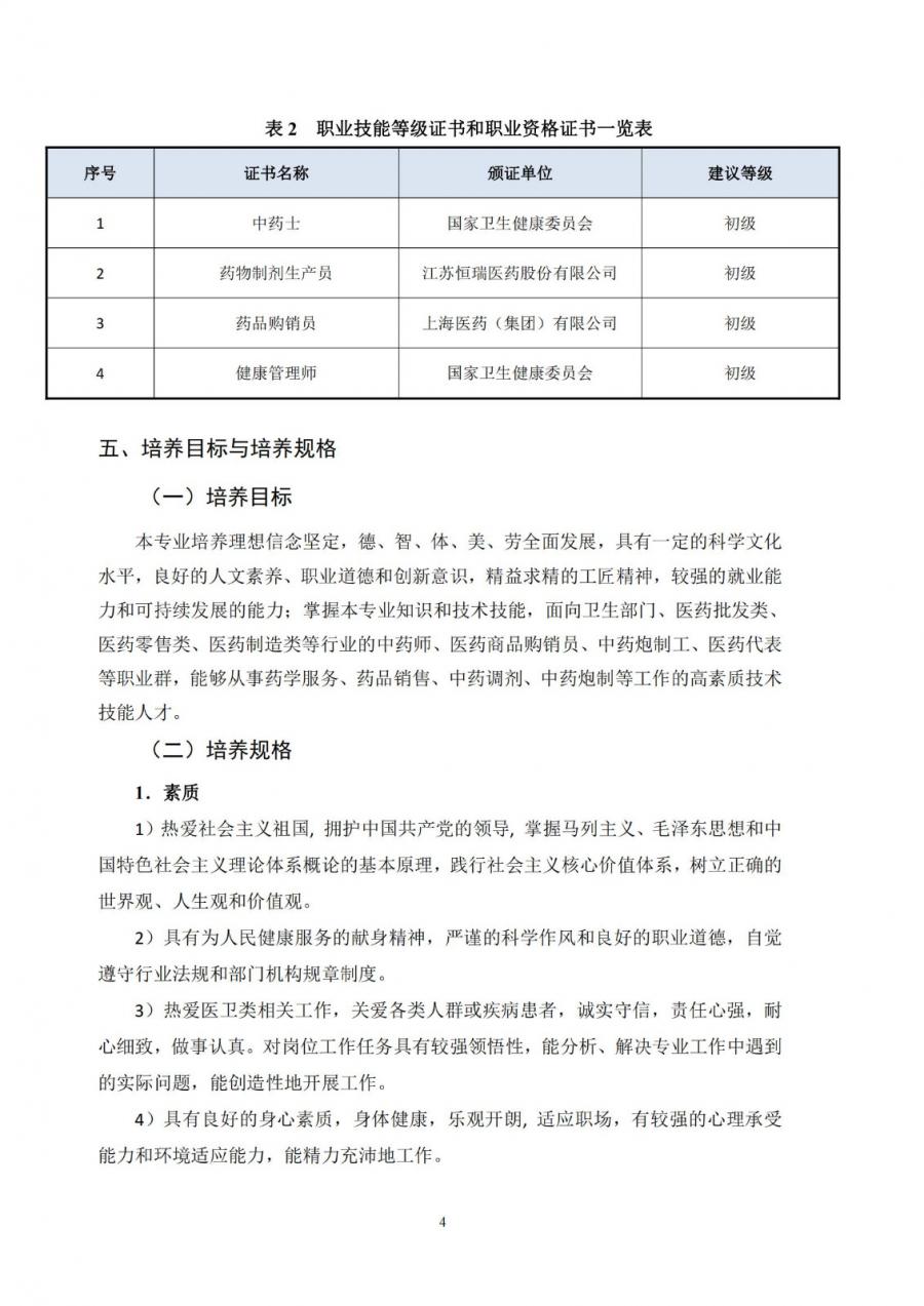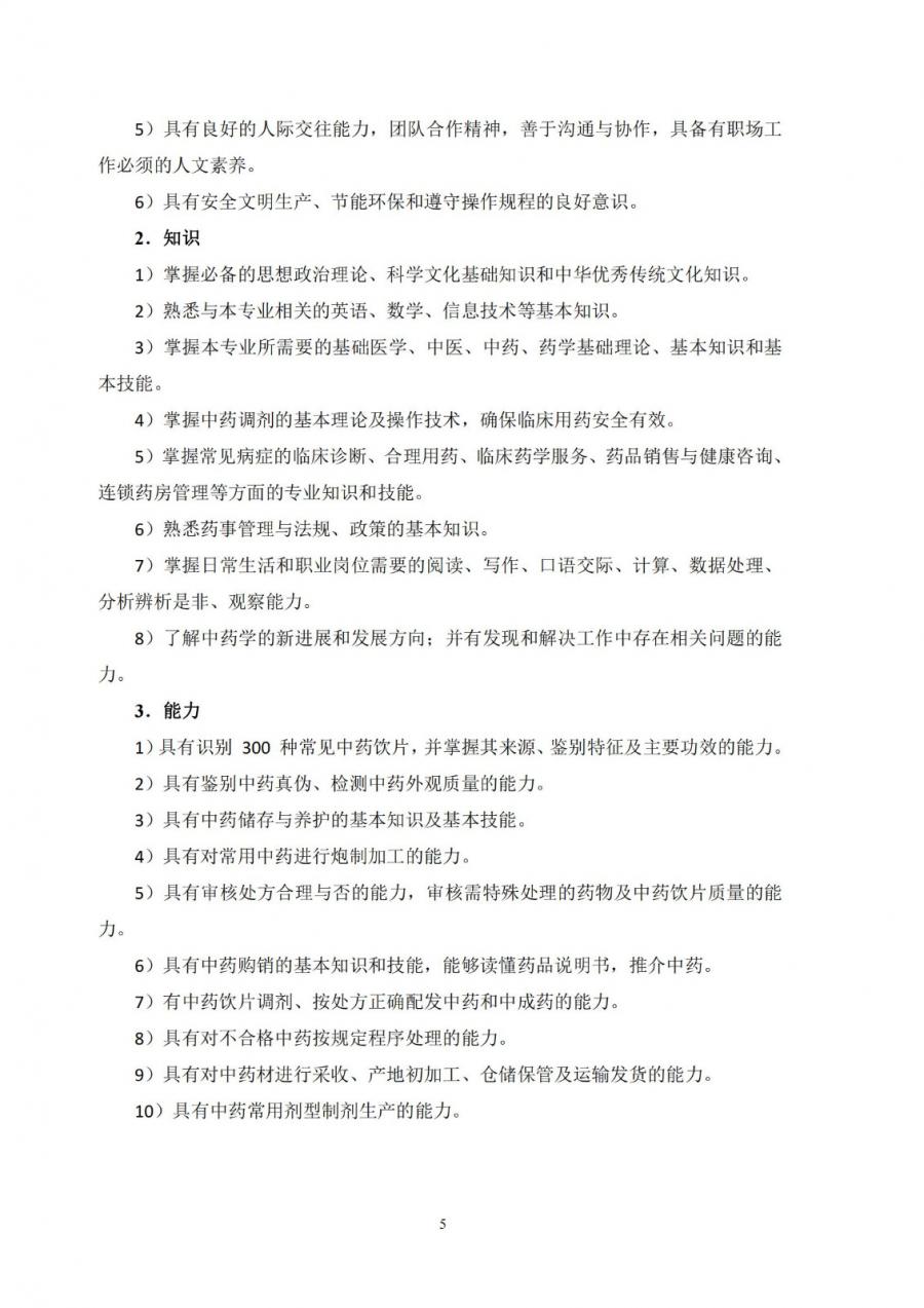 本专业培养理想信念坚定,德、智、体、美、劳全面发展,具有一定的科学文化水平,良好的人文素养、职业道德和创新意识,精益求精的工匠精神,较强的就业能力和可持续发展的能力;掌握本专业知识和技术技能,面向卫生部门、医药批发类、医药零售类、医药制造类等行业的中药师、医药商品购销员、中药炮制工、医药代表等职业群,能够从事药学服务、药品销售、中药调剂、中药炮制等工作的高素质技术技能人才。