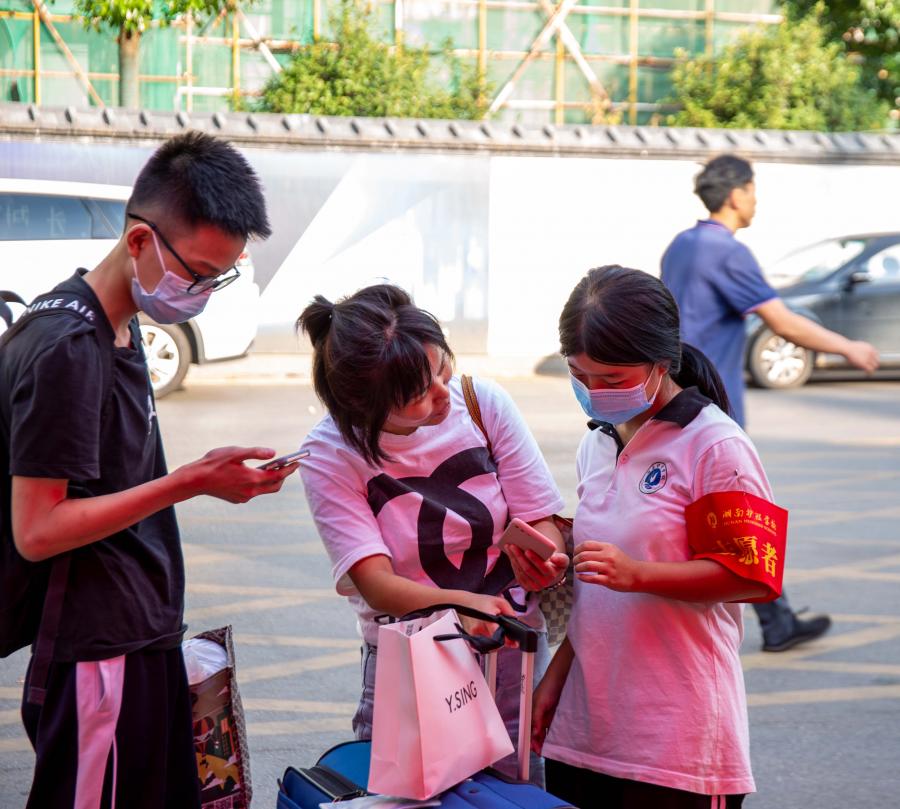 带着红色袖章的学生,是热心助力开学的志愿者,他们或变成“指路人”,带领家长和新生办理进行报到;或变身为“搬运工”,帮助新生把行李搬到宿舍,让学弟学妹们感受到丝丝温暖与感动。