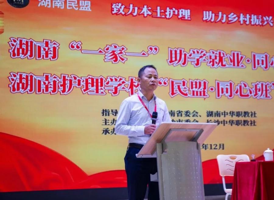 丁志强代表学校感谢民盟湖南省委会、长沙市委会领导的重视,表示学校将积极贯彻落实党的二十大精神,坚定习近平总书记的谆谆嘱托,持续开展湖南“一家一”助学就业·同心班,希望能通过学校的行动和媒体的宣传,吸纳更多的爱心人士加入到这样的善举中来,让更多贫困家庭的孩子能读成书、读好书,成为具有一技之长的有用应用型人才,成为守护基层健康使者和家庭脱贫致富的带头人。