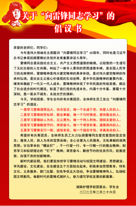 希望所有共青团员、全体师生员工学习并坚守雷锋同志爱党爱国的坚定信念,服务人民、助人为乐的宝贵品格,全心全意为人民服务、无私奉献的崇高思想,干一行爱一行、专一行精一行的敬业精神以及艰苦奋斗、勤俭节约的优良作风。老师们、同学们,让我们积极行动起来,为全社会学雷锋、树新风作出榜样,让学习雷锋精神在美丽的湘护校校园蔚然成风,共同促进学校教育事业实现更大的发展!