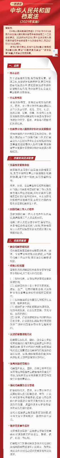 2021年7月6日,习近平总书记对档案工作作出重要批示:档案工作存史资政育人,是一项利国利民、惠及千秋万代的崇高事业。希望你们以此为新起点,加强党对档案工作的领导,贯彻实施好新修订的档案法,推动档案事业创新发展,特别是要把蕴含党的初心使命的红色档案保管好、利用好,把新时代党领导人民推进实现中华民族伟大复兴的奋斗历史记录好、留存好,更好地服务党和国家工作大局、服务人民群众!