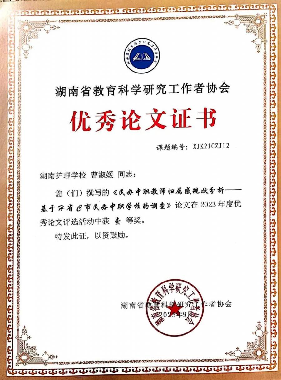 曹淑媛老师所著《民办中职教师归属感现状分析---基于H省C市民办中职学校的调查》一文在本次评选活动中获评一等奖。