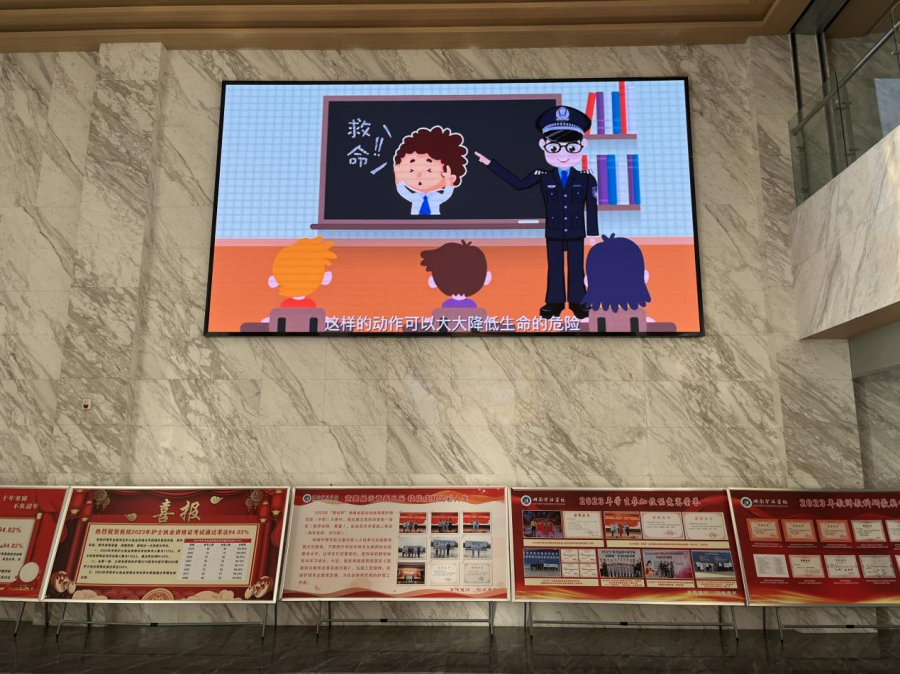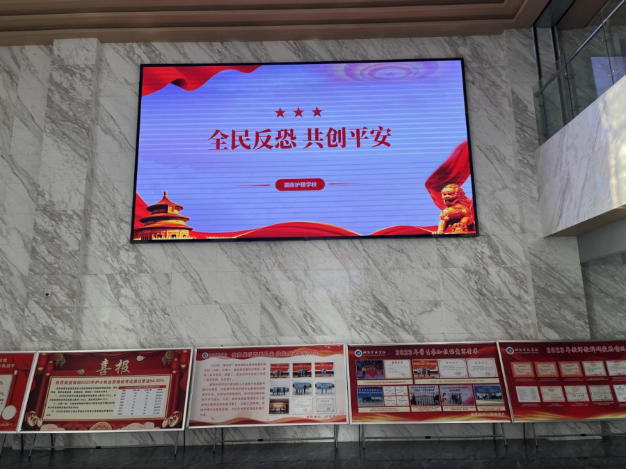 为加强宣传效果,学校在教学楼内媒体设备同时开展宣传。通过播放反恐宣传片,向全体师生普及恐怖袭击的常见形式,传递防范的重要性。
