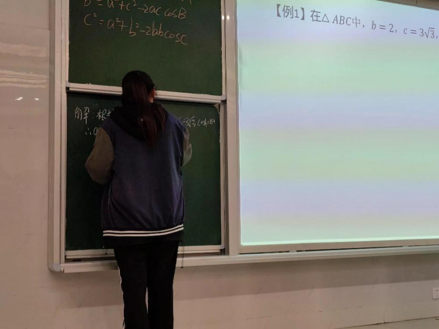 戴丽花老师教学思路清晰,教学态度严谨。她从初中学过的知识入手,结合实际问题,带领学生一步步推导出余弦公式;精心设计教学过程,用不同颜色的粉笔标记教学重点,讲练结合,课堂氛围轻松愉快,体现了学生主体,做到了多种教学方法的有机结合。45分钟的教学展示,精彩纷呈。