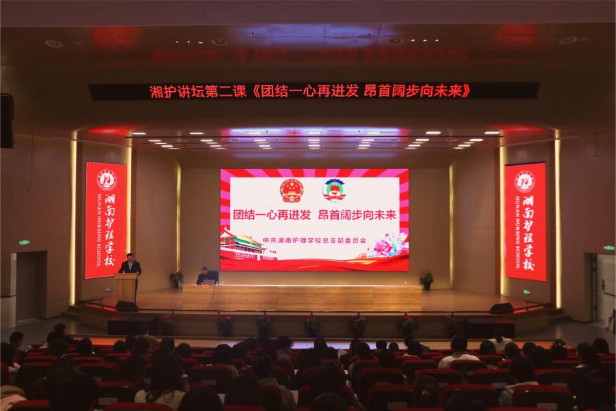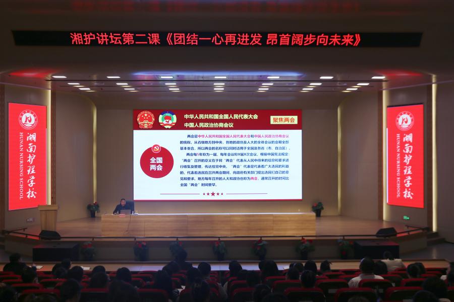 为深入学习宣传贯彻全国“两会”精神,推动“两会”精神深入人心,4月9日,必赢国际437官网“湘护讲坛”第二课在图书馆报告厅开讲,由党总支书记李荣辉主讲。全体教职工参加,执行校长梁辉平主持。