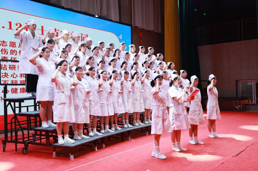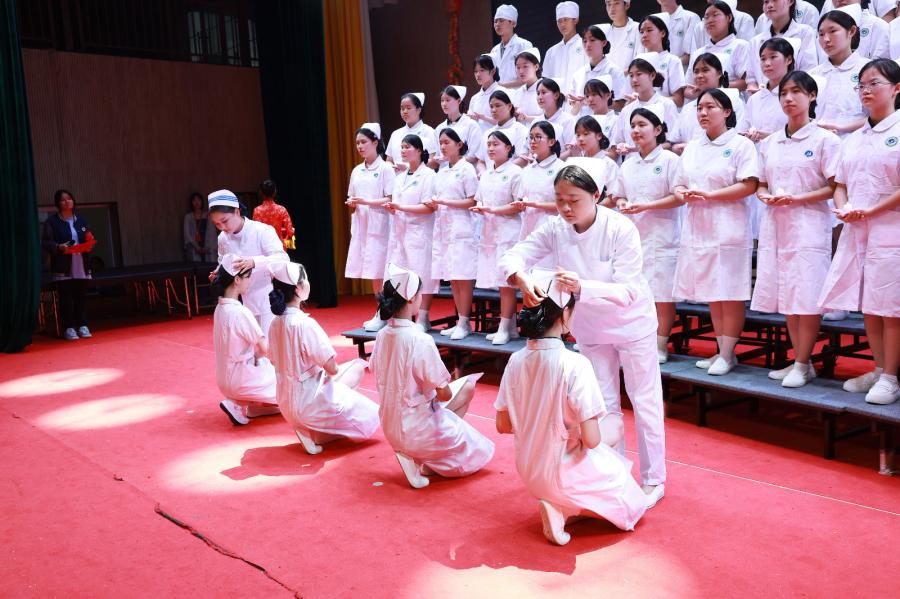 授帽宣誓仪式开启了一场精彩的视听盛宴。洁白的燕尾帽象征着圣洁的天使,燃烧的蜡烛象征着燃烧自己,照亮他人。在全校师生的见证下,护理专业罗益芬、宋金烨老师为护理专业同学戴上了燕尾帽,带领学生庄严宣誓:“终身纯洁,忠贞职守。勿为有损之事,勿取服或故用有害之药。尽力提高护理之标准,慎守病人家务及秘密。竭诚协助医生之诊治,务谋病者之福利。”仪式感满满的授帽仪式,戴上的是燕尾帽,同时也是沉甸甸的责任,是南丁格尔的精神。