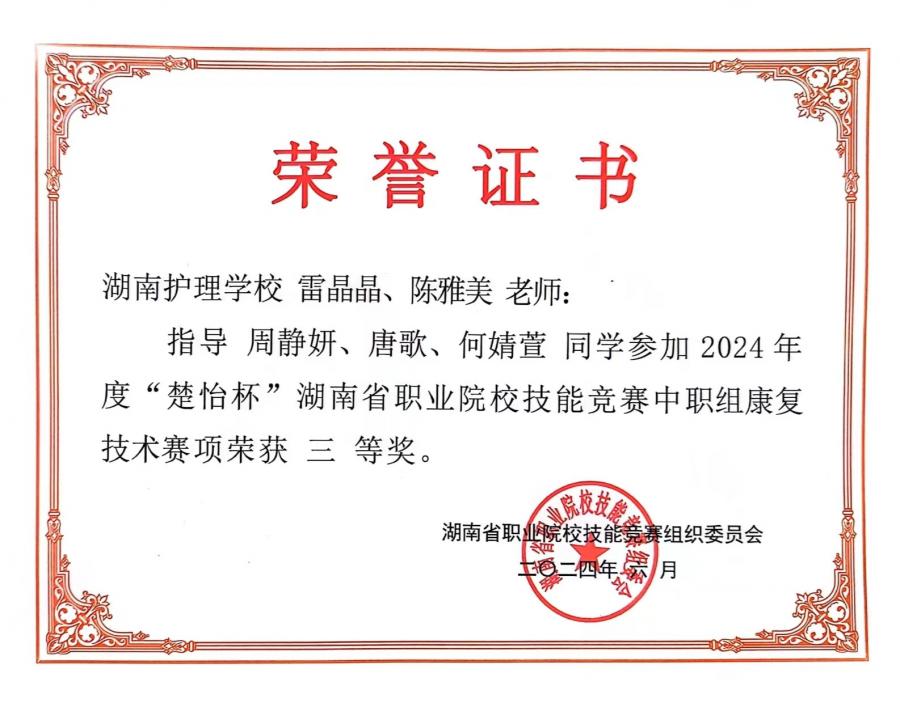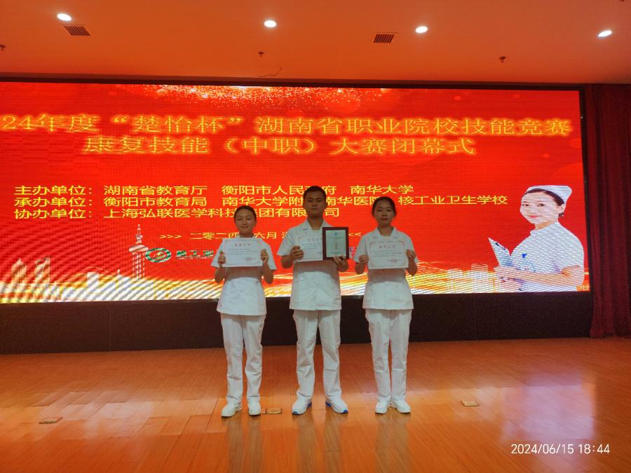 2024年6月14至15日,2024年度“楚怡杯”湖南省职业院校技能竞赛康复技术(中职)大赛在衡阳核工业卫生学校举行,来自湖南省各市州的13支队伍39名选手参加本次比赛,比赛分为理论赛和操作赛。经过2天紧张激烈的比赛,必赢唐歌、何婧萱、周静妍同学荣获三等奖,指导老师陈雅美、雷晶晶。