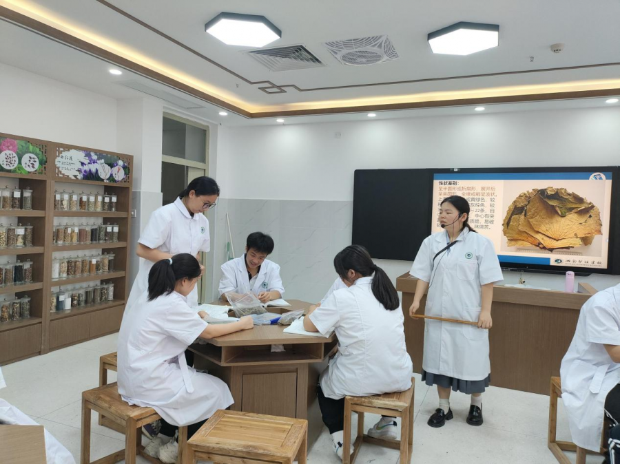 侯露老师为学生们精心组织了一场中药鉴定实训课程。本次实训课程以“叶类”药材为主题,侯老师精心挑选了十几种具有代表性的叶类药材,供学生们观察学习药材的形态、色泽等特征,并详细讲解了各种药材的鉴别要点和药用价值。她鼓励学生们积极参与,动手实践,通过亲身操作加深对药材特性的理解。课程最后,侯老师设计了一个抢答环节,学生们积极参与,争相回答问题。这一环节不仅检验了学生们的学习成果,也进一步活跃了课堂气氛,使实训课程取得了圆满成功。