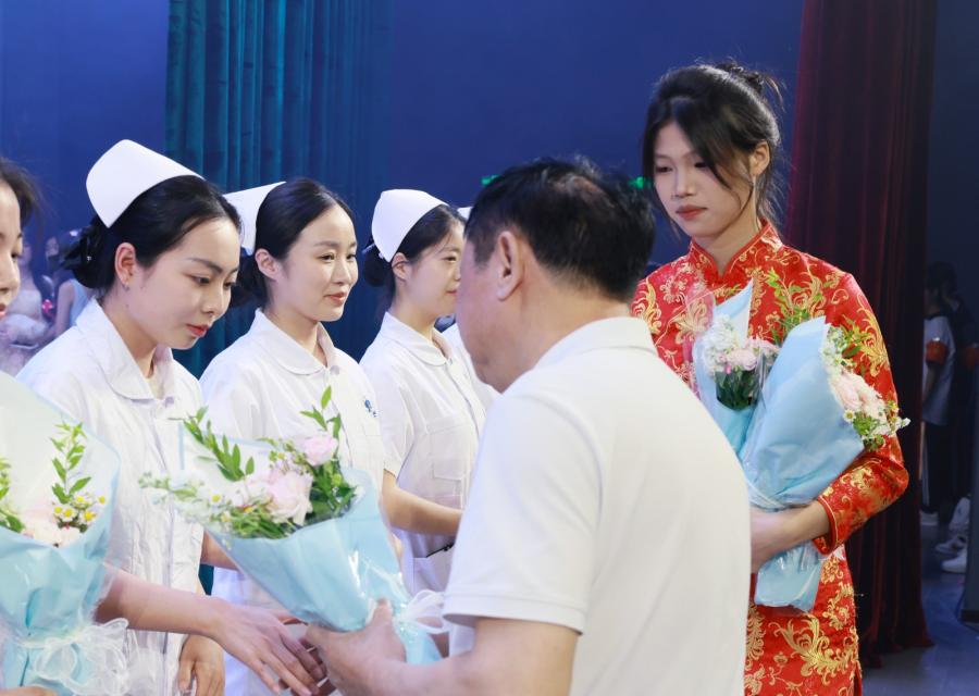 随后,唐圣松校长手捧鲜花,走向辛勤耕耘、默默奉献的全体护理专业教师。一束束鲜花,承载着全体师生对护理教师的感恩与敬仰,也彰显出学校对护理教育工作的高度重视与深切关怀。
