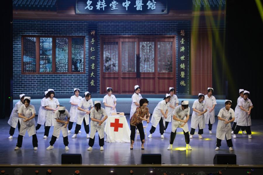 24171班、24172班、24173班带来的合唱《仰望星空》,歌声悠扬,唱响对理想的追寻与坚守;模特社的走秀节目《以花为名》,以花喻人,模特们优雅的步伐、自信的姿态,演绎出新时代白衣天使如花朵般既温柔呵护生命,又坚韧面对挑战的独特风采;24170班情景剧《成长之路》,以温情叙事回顾护理学子从青涩到成熟的成长旅程,触动人心,引发全场共鸣。