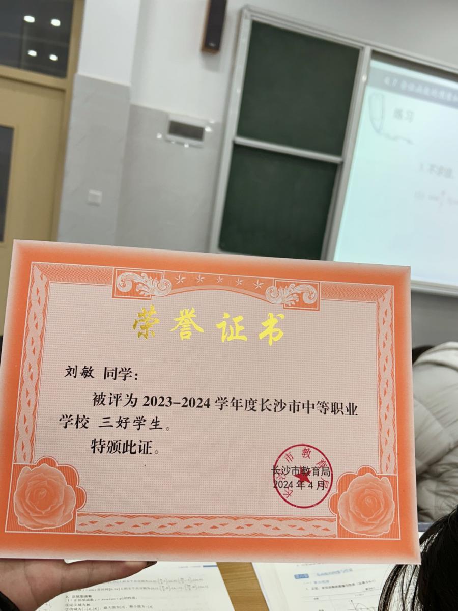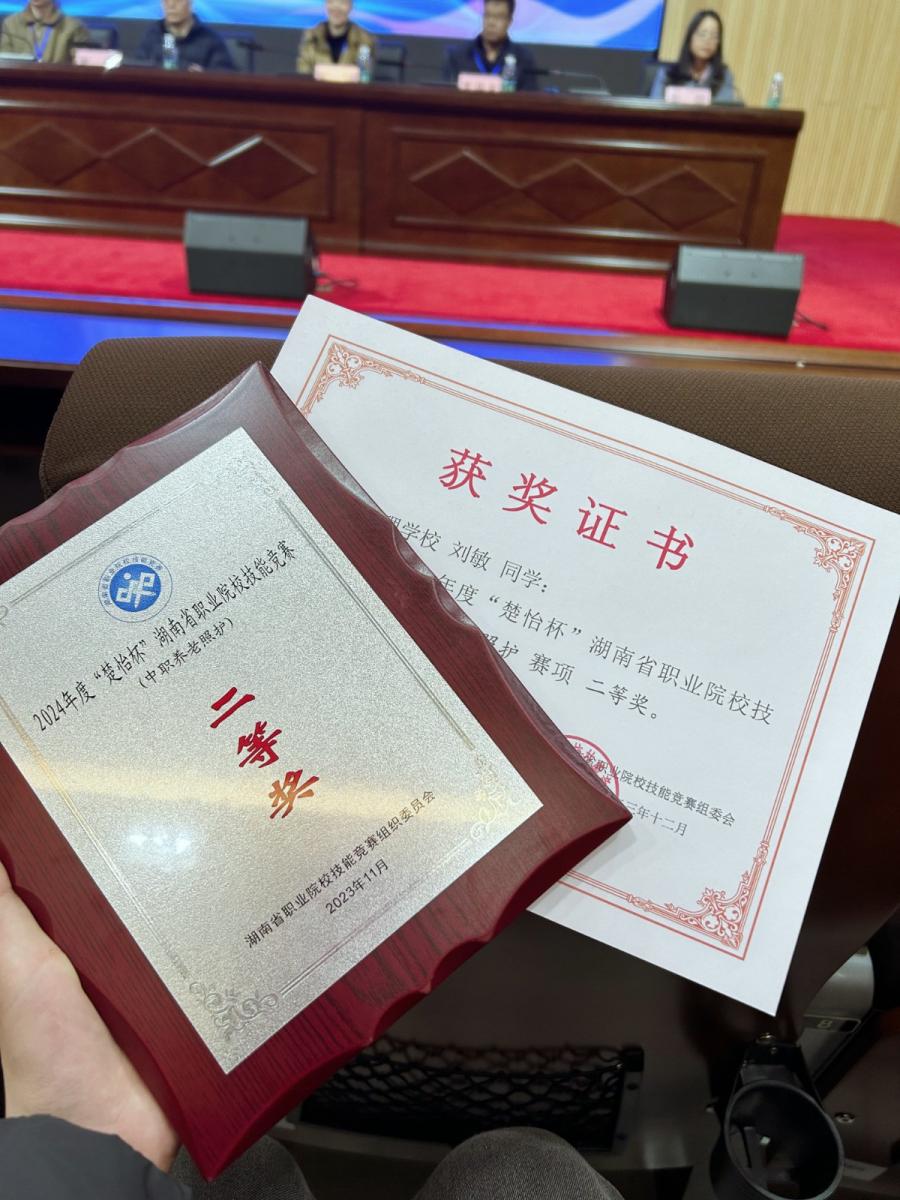 在校荣誉:曾获得多次三好学生,并获得2023-2024年长沙市三好学生。2023年获得长株潭母婴技能竞赛一等奖、湖南省“楚怡杯”老年照护二等奖。