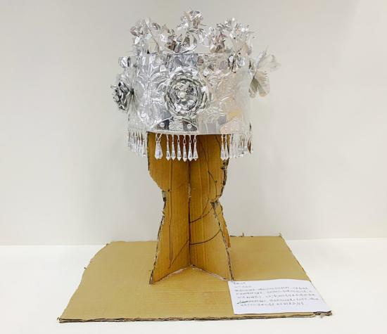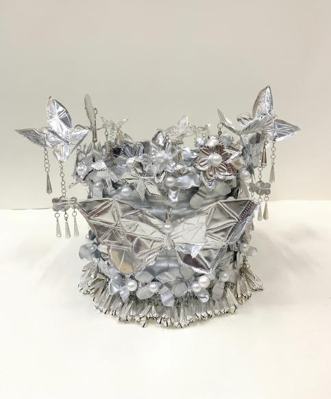 创意阐释:银为意,冠为形。本作品巧妙选用环保材料,塑料瓶剪制花瓣,锡纸雕刻蝴蝶与花纹,通过铁丝精巧连接,构成一顶别致灵动的银冠。这顶银冠,是一次关于再造与想象的灵感之作,也是青春巧思与环保理念的精彩交汇。