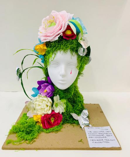 创意阐释:苔藓、多彩花朵以及蝴蝶,代表着大自然的多样与生机。寓意着生命的蓬勃与美好,传达对自然的热爱和赞美。作品中人物眼角的泪,提醒人们珍视自然的馈赠。