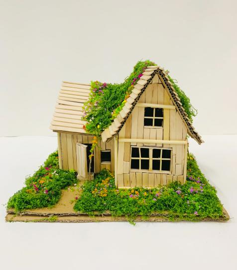 创意阐释:以废弃雪糕棍为材,构建小屋,践行环保,展现资源再利用的创意与智慧。借承载童年记忆的雪糕棍,搭温馨小屋,让童年甜蜜幻化为触手可及的梦想家园。