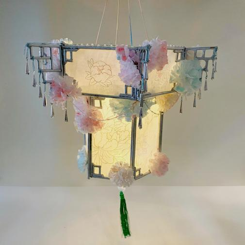创意阐释:利用一次性筷子、纸巾、粉笔、宣纸,通过设计制作灯架、灯罩,完成作品。灯罩上的蝴蝶、花朵等图案设计不仅具有装饰性,更表达了对美好生活的向往。