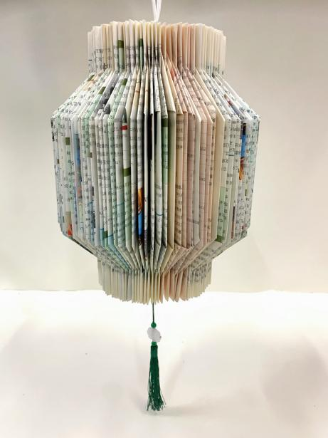 创意阐释:古风为形,旧书为魂。本作品将废弃书籍再造为创意纸灯笼,为文字注入新的生命与温度,延续书本的价值与意义。它不仅是一件手工艺品,更是一种环保理念的艺术表达。置于书架、桌面或床头,既是一盏静谧温柔的光,也是一份对旧物惜福、对文化致敬的情感寄托。